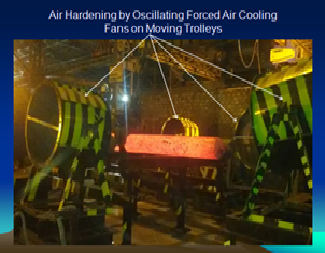 Goradia Steel has developed a In-House arrangement to Air Quench Steel. The specially designed facility ensures Cyclone Type Air Blast on Steel. Such Cyclone effect Air Blast ensures Air Flow from ALL Sides ; Top, Bottom & Both Sides. Such equal Air Blast ensures Uniform Cooling of entire Bars thereby ensuring Uniform Mechanical Properties from end to end.